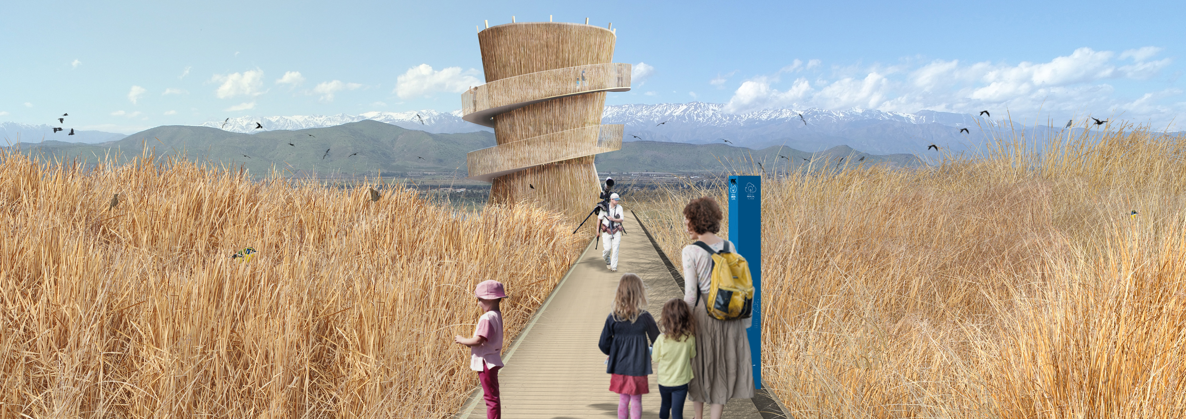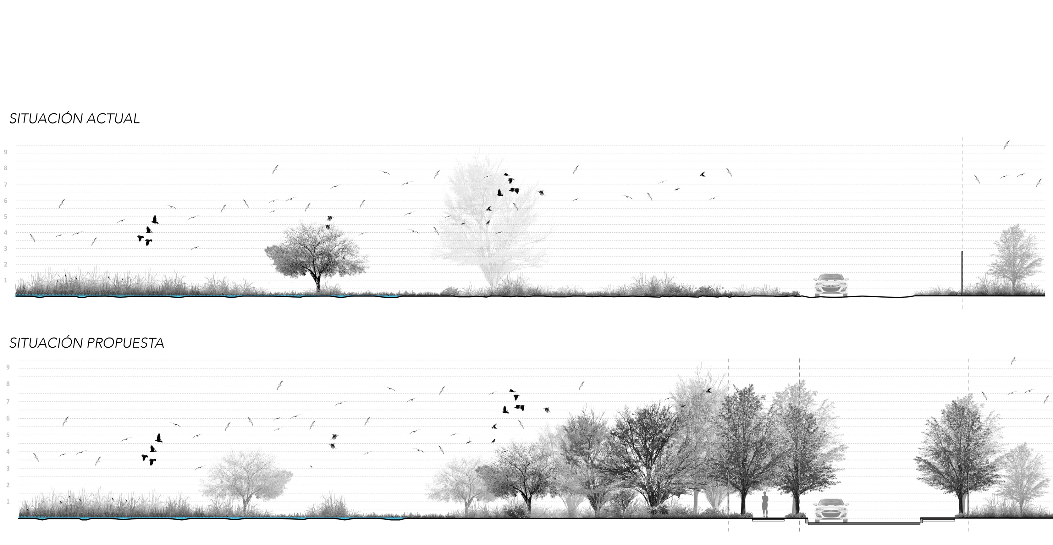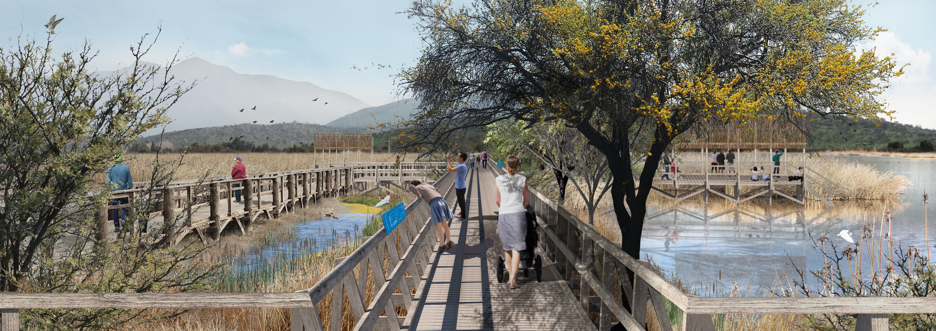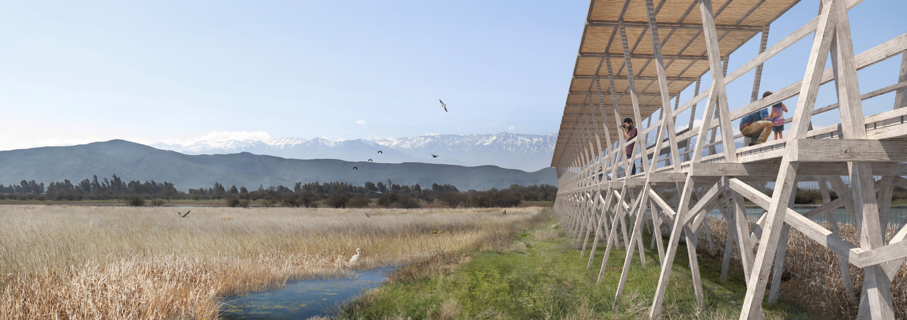 La flexibilidad de la propuesta se ejemplifica en la implementación de escaleras-miradores que se utilizan para activar el sitio y testear posiciones y vistas antes de consolidar una propuesta definitiva. Estas estructuras móviles se localizan alrededor del cuerpo de agua, tomando cierta distancia de zonas delicadas, y teniendo especial cuidando con su impacto ecológico en el sitio. La provisión de puntos de vista en altura abre visualmente la totalidad de la laguna insinuando el potencial de un futuro parque de gran escala.