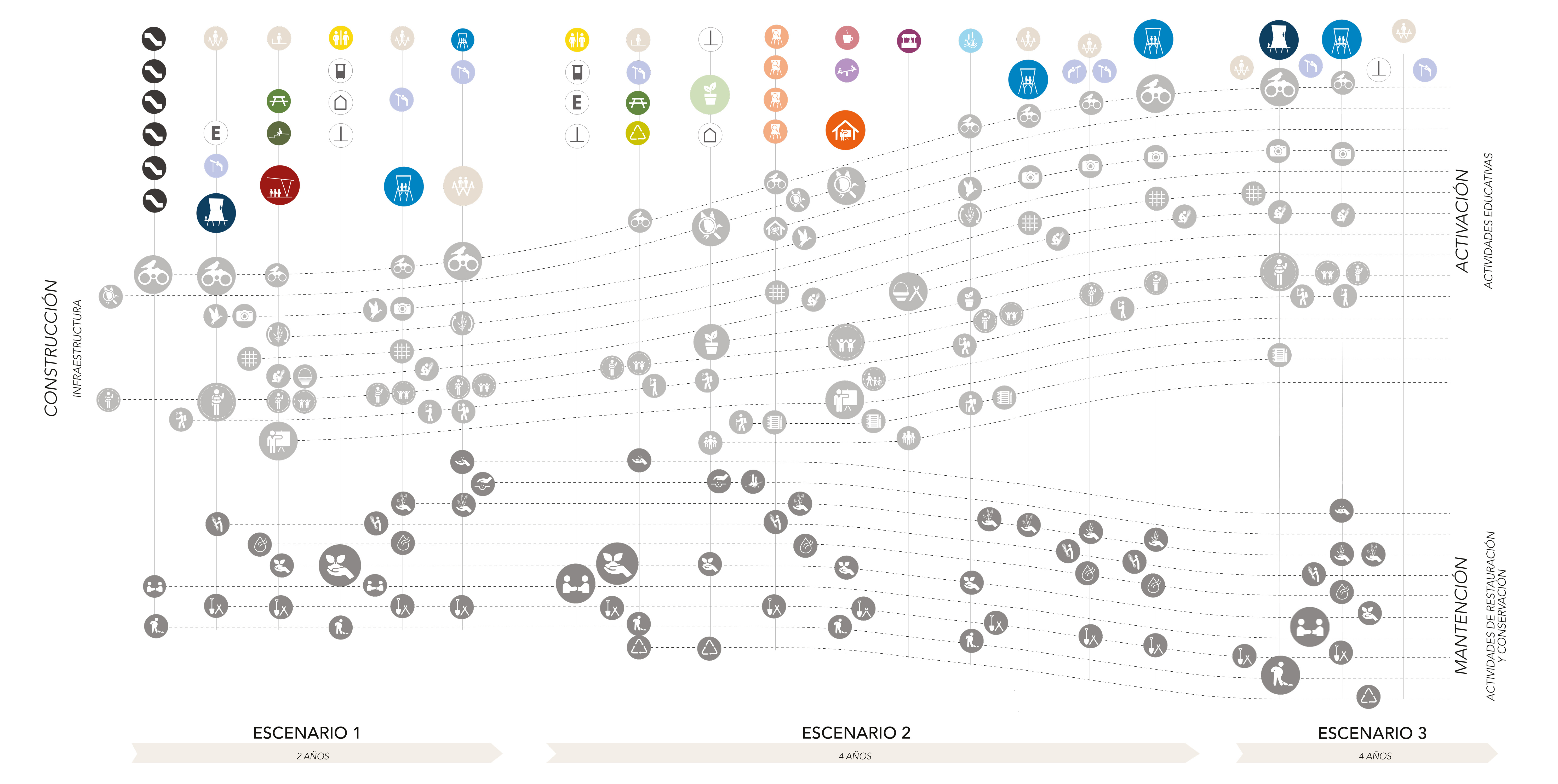 Matriz de uso que organiza la infraestructura construida con las actividades relativas a la mantención, rehabilitación y activación del parque en un espectro temporal. El balance entre lo material e inmaterial no se plantea como una constante: lo construido toma relevancia inicial pues demuestra la realidad del proyecto, y continúa implementándose de un modo más esporádico en el tiempo, mientras las actividades de mantenimiento se incrementan paulatinamente.