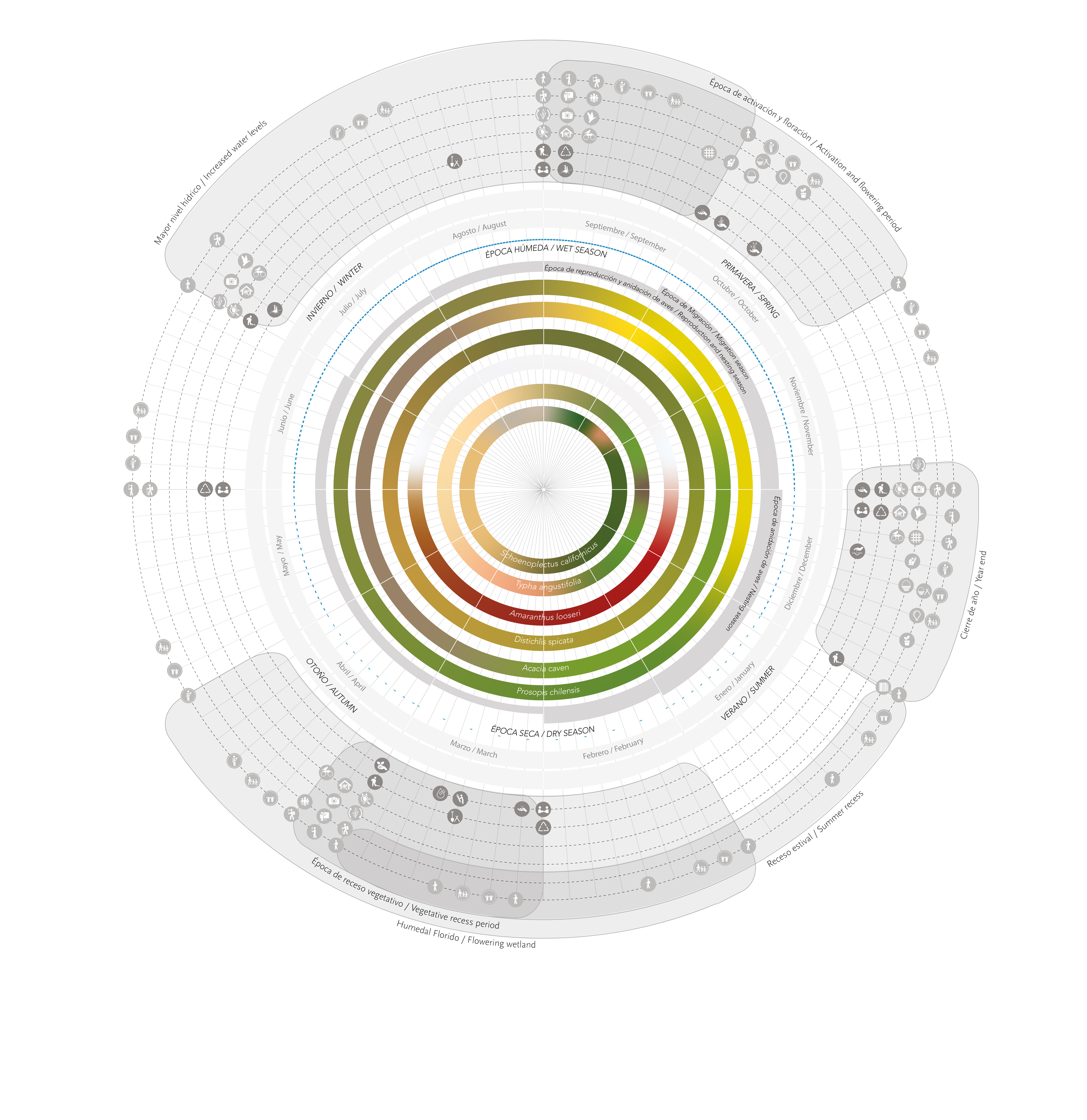 Ordenamiento de actividades de mantenimiento, rehabilitación y activación del parque, en torno a hitos anuales del ecosistema de humedal. Se considera para ello la variación del nivel de agua de la laguna, la transición del comportamiento de las aves (períodos de reposo, anidación y migración) y el desarrollo de especies vegetales dominantes (gestación, floración, fruto y receso), cuya paleta de colores variable determina la apreciación estética de la visita a lo largo del año.